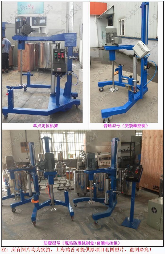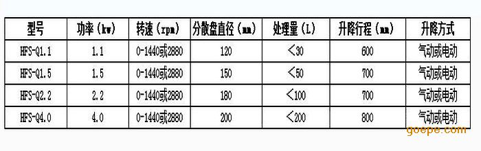 产品实物:型号 处理量(L) 功率(kw) 转速 (rpm) 分散盘直径(mm) 升降行程(mm) 重量(kg) HFSQ-1.5 ≤60 1.5 0-1450 120 600 250 HFSQ-2.2 ≤100 2.2 0-1450 150 600 300 HFSQ -4 ≤200 4 0-1450 200 800 350 HFSQ-5.5 ≤300 5.5 0-1450 230 800 450 HFSQ-7.5 ≤400 7.5 0-1450 230 900 550 HFSQ-11 ≤500 11 0-1450 250 900 700